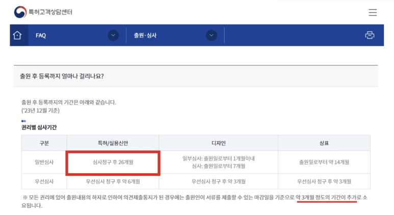 그러나 이 수치는 우선심사 사건을 포함한 평균값으로, 실제 일반 심사만을 기준으로 보면 통상 2년 이상의 기간이 소요됩니다.