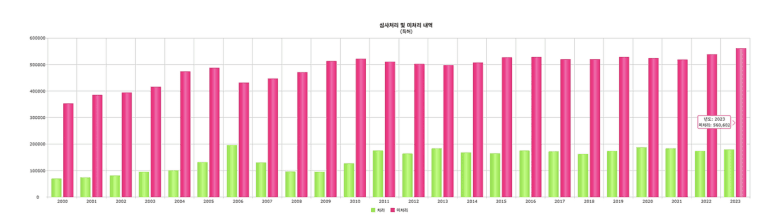 『지식재산백서』의 통계에 따르면 2022년 이후 적체 물량(자주색 그래프)이 지속 증가 중